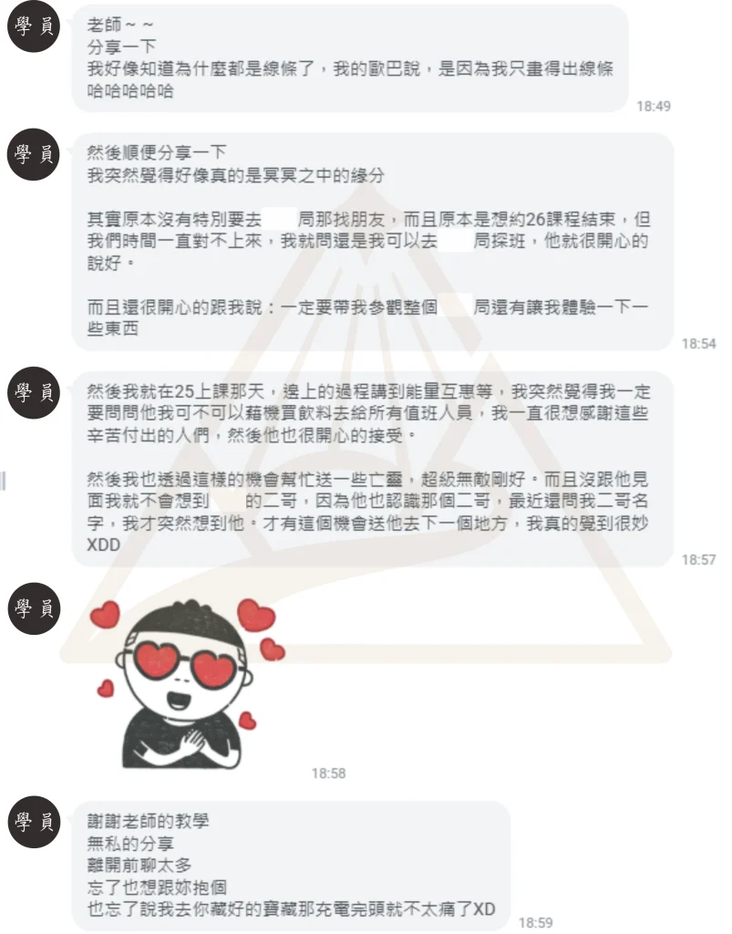 找了幾個靈性課程後,他向主神請教擲筊,也透過靈擺詢問高我,最後決定來跟我上課。我看著學員描述他來上課的動機,眼神中充滿堅定,我感謝他的主神願意相信我讓他從台北來到高雄找我上課,同時也感謝這位學員願意重新認識自己。